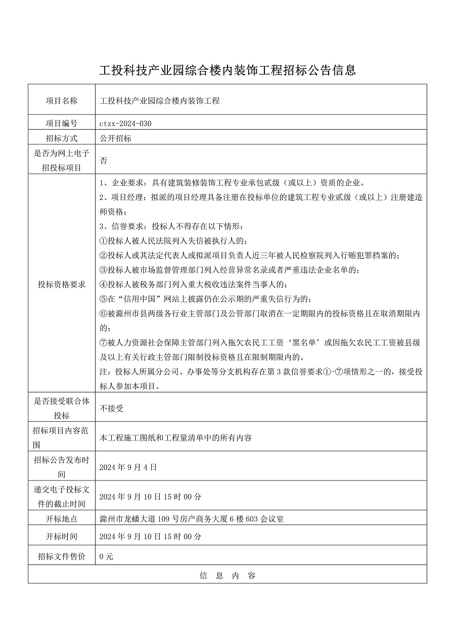 工投科技產(chǎn)業(yè)園綜合樓內裝飾工程招標公告信息